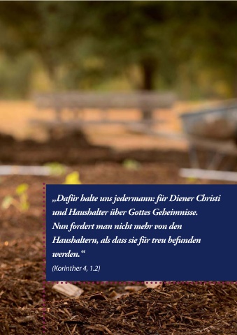 „Dafür halte uns jedermann: für Diener Christi und Haushalter über Gottes Geheimnisse. Nun fordert man nicht mehr von den Haushaltern, als dass sie für treu befunden werden.“ (Korinther 4, 1.2) 9